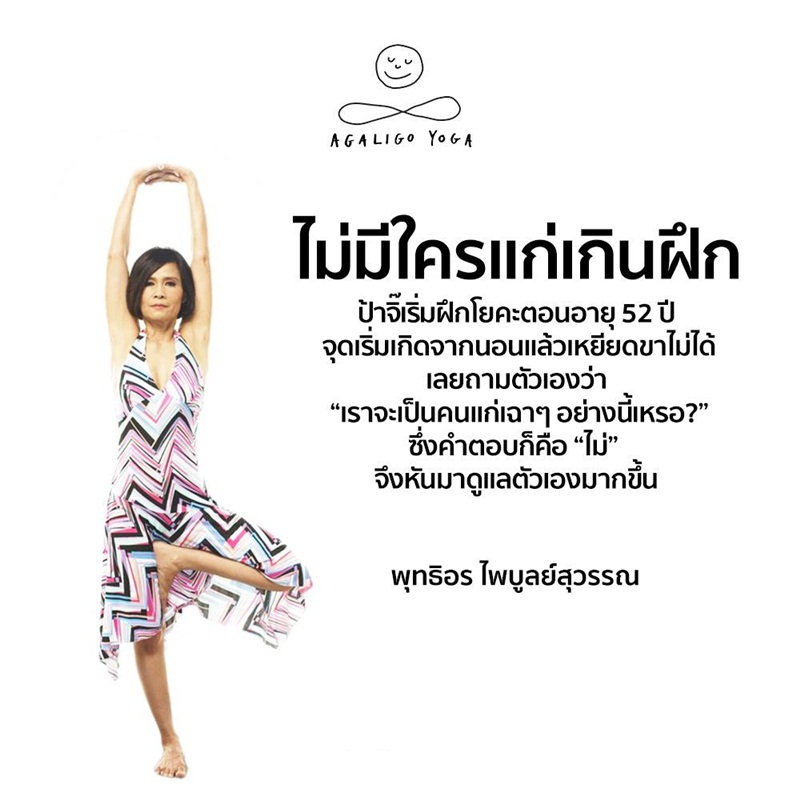 ป้าจิ๊ อัจฉราพรรณ ในวัย 66ปี กลายเป็นผู้สร้างแรงบันดาลใจในการหันกลับมาใส่ใจการดูแลตนเองให้แก่หนุ่มสาวมากมาย เราต่างรู้จักป้าจิ๊กันดีว่าเธอคือผู้ที่รักและหลงใหลการเล่นโยคะอย่างจริงจัง ป้าจิ๊เล่าว่าเธอเพิ่งเริ่มออกกำลังกายด้วยการเล่นโยคะ ตอนอายุ 50 กว่า ซึ่งก่อนหน้านั้นเธอแทบไม่ได้ใส่ใจการดูแลสุขภาพเลย เพราะมัวแต่ทุ่มเทเวลาให้การทำงาน จนกระทั่งลองปฎิบัติอย่างจริงจัง จนถึงขั้นพัฒนาเป็นความชำนาญจนกลายเป็นครูสอนโยคะที่ได้รับการยอมรับอันดับต้นๆ คนหนึ่งของบ้านเรา (ที่มาภาพจาก www.facebook.com/Agaligoyoga)