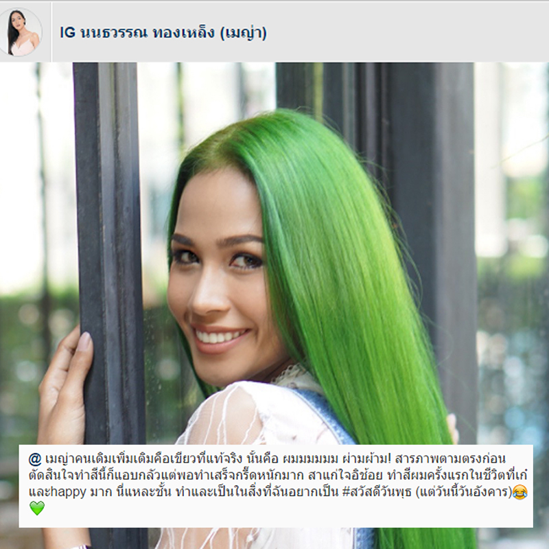 เรียกได้ว่าเป็นลุคที่แปลกตาไปเลย สำหรับมาดนางเอกละคร เพราะล่าสุดเธอได้เปลี่ยนเป็นผมสีเขียว กัดจริง ย้อมจริง เขียวจริง เมญ่าตัวจริง แหกกฏนิยามของนางงาม นางเอกไปเลย ซึ่งเมญ่าให้เหตุผลว่าที่เปลี่ยนไป จนทำเอาคนตกอก ตกใจขนาดนี้ ก็แค่อยากปรับลุคที่ตัวเองตั้งใจว่าอยากจะทำมาตั้งนานแล้วเท่านั้นเองจ้า