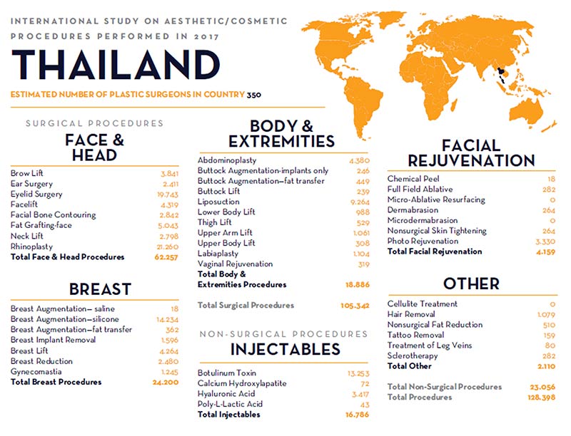 นอกจากนี้ จากรายงานของสมาคมศัลยแพทย์ตกแต่งเสริมสวยนานาชาติ หรือ (ISAPS) ยังพบว่า ประเทศไทย มีผู้นิยมทำศัลยกรรมเสริมหน้าอก, ศัลยกรรมดูดไขมัน, ศัลยกรรมเสริมจมูก, ศัลยกรรมตาสองชั้น และศัลยกรรมตกแต่งหน้าท้อง ติดอันดับท็อป 10 ของโลก แต่ที่น่าสนใจคือ สถิติตัวเลข ชาวต่างชาติเข้ามาทำศัลยกรรม ในรูปแบบ Medical Tourism ในประเทศไทยเฉลี่ยกว่า 30%