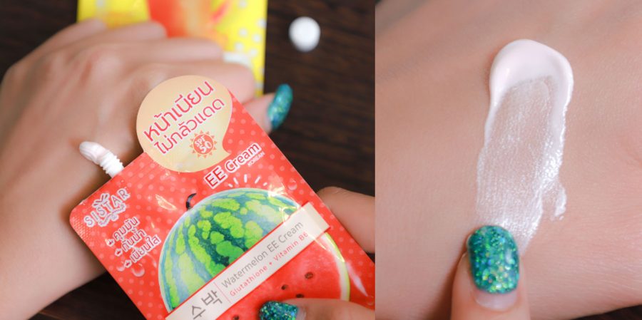 ลุควันนี้เป็นงานผิวแบบเบาๆ เราจึงเลือกใช้ Sistar Watermelon EE Cream หรือที่เรียกกันว่า #EEแตงโมหน้าเนียน ตัวนี้จะช่วยปกป้องผิวของเราจากแสงแดด ผสานคุณค่าจากแตงโมเข้มข้น กลูต้าไธโอน และวิตามินบี 6 ช่วยปรับผิวให้ดูกระจ่างใส อิ่มน้ำ ปกปิดได้ดี ที่สำคัญคุมมันอีกด้วย โดยเริ่มลงให้ทั่วใบหน้า