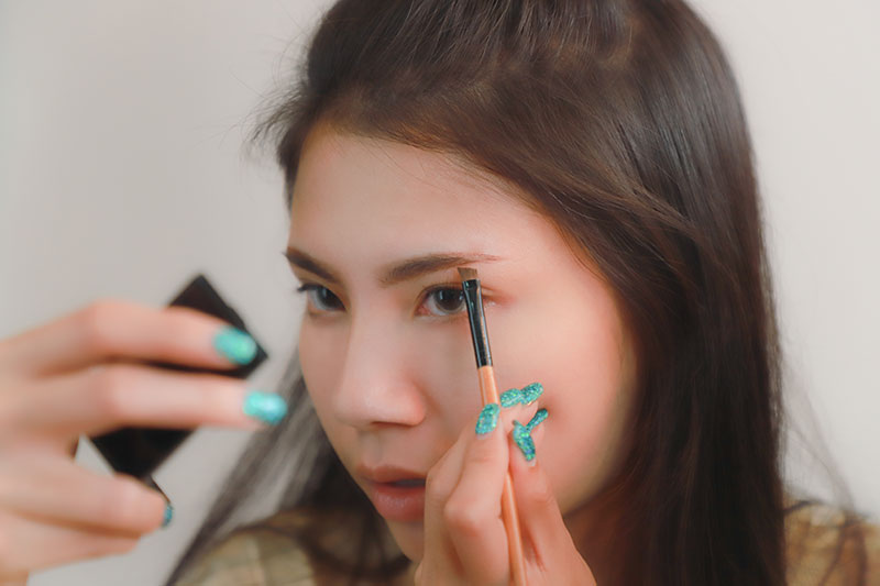พยายามเขียนคิ้วให้ทรงตรงที่สุด เพราะคิ้วทรงตรงจะทำให้หน้าดูเด็กลงไปอีก เขียนให้ดูฟุ้งเป็นธรรมชาติที่สุด