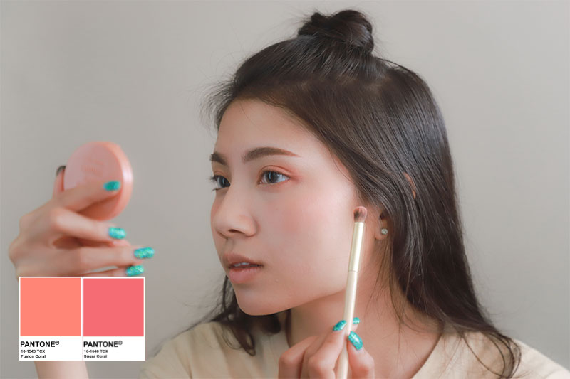 ลงครีมบลัชที่บริเวณหน้าแก้ม โดยเลือกใช้ Coral Pantone สี #FusionCoral เพื่อให้ได้แก้มสีอ่อนๆ ดูเป็นธรรมชาติ