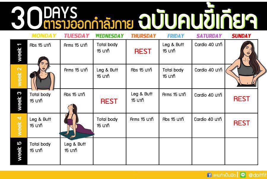 เดือนแรก/ลดน้ำหนัก : คาร์ดิโอ 40 นาที และตามด้วยคลิปเวทในยูทูปอีก 2 คลิป