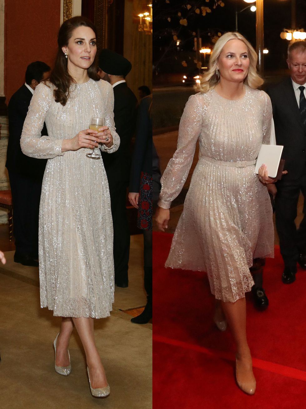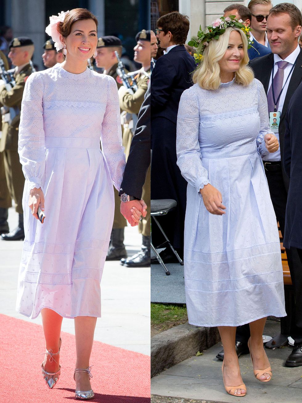 เจ้าหญิงเมตเต-มาริต สวมเดรสสีแดงของ Raquel Diniz ไปงานเปิดนิทรรศการที่นอร์เวย์ ในปี 2017 ในขณะที่เจ้าหญิงแมรี่ทรงสวมที่เดนมาร์กในปี 2018