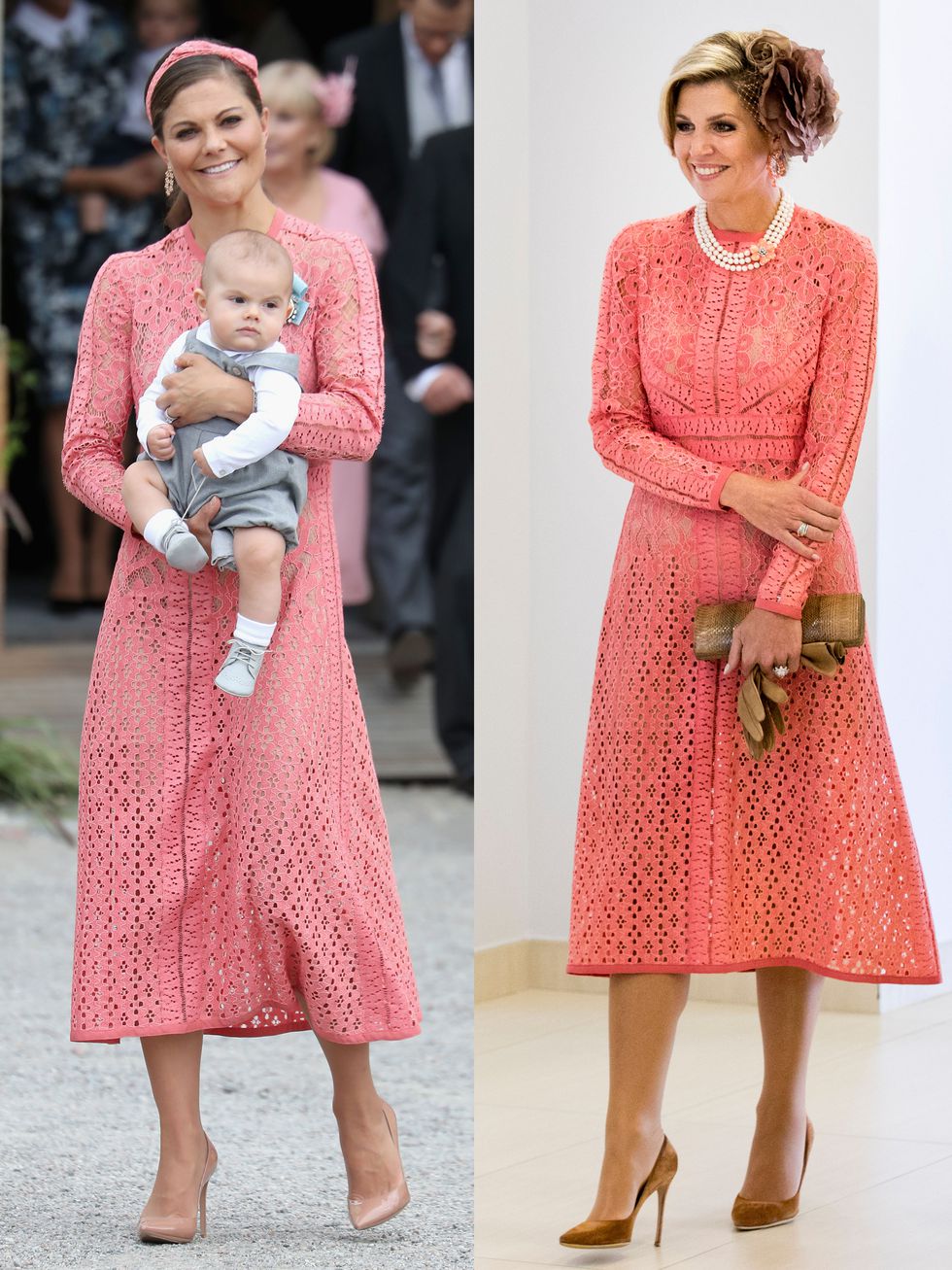 เดรสยาวลายดอกของ Giambattista Valli ที่สวมใส่ห่างกัน 1 ปี โดยสมเด็จพระราชินีแม็กซิม่าสวมไปงานคอนเสิร์ต ในปี 2017 ส่วนเจ้าหญิงมาเดอลีนไปร่วมงานกาล่าที่นิวยอร์กปี 2018