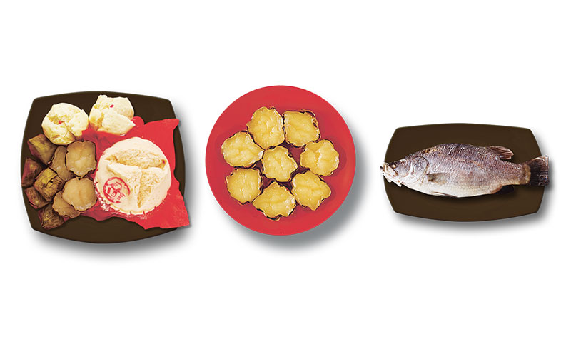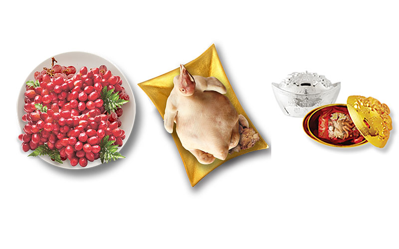 - ของไหว้มงคล ประกอบด้วยอาหารคาว หมึก ปลา เป็ดผลไม้ได้แก่ สาลี่ แปลว่าโชคมาหากล้วยหมายถึงความราบรื่นในการดำเนินชีวิตตลอดปี