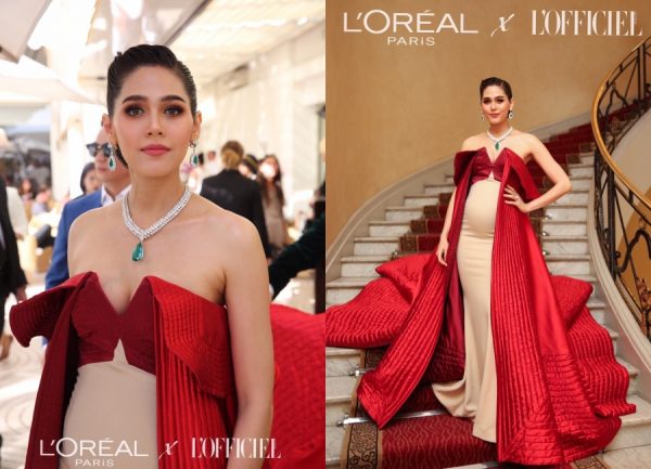 ชุดเดรสเกาะอกสีครีมทรงชายหางปลา เสริมความกูตูร์ด้วยซิลูเอทต่อเคปช่วงอกกับผ้าปักลายยาวสีแดง