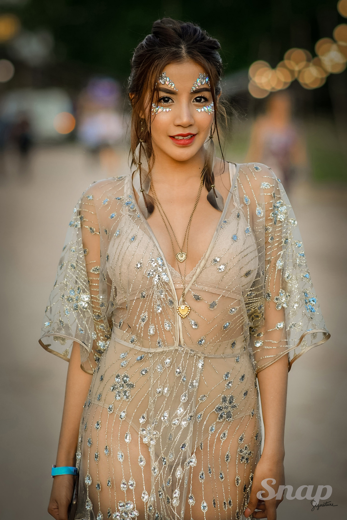 สไตล์โบโฮของสาวใบเตย แค่แมทช์บิกินี่ทูพีชสีเนื้อ กับเดรสซีทรูปักลายดอกลิลลี่ จากแบรนด์ jesginda.clothing สุดเซ็กซี่ เข้ากับการแต่งหน้าด้วยกลิตเตอร์ ในสไตล์โบฮีเมียน แมทช์กับต่างหูขนนก ซึ่งทั้งชุดคลุมโทนสีน้ำตาลนู้ด สวยวิบวับ โดดเด่น เซ็กซี่เผ็ชเว่อร์