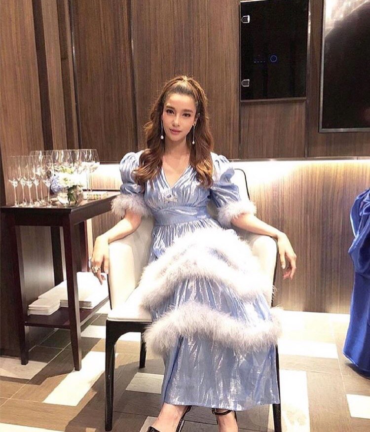 นางเอกสาวหน้าหวาน น้ำตาล – พิจักขณา วงศารัตนศิลป์ ในชุดเดรสเข้ารูปสีฟ้าอ่อนประดับระบายรัฟเฟิลสวยหวานจากแบรนด์ ‘มินิสทรี ออฟ สไตล์’ (Ministry Of Style)