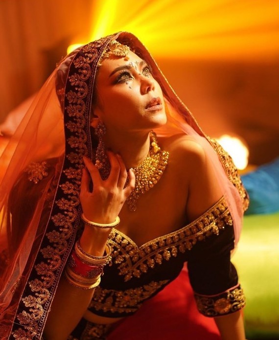 ชุดราตรีแดงยาว ลูกไม้ซีทรู ลุคราชินีแห่งอาณาจักรออตโตมัน สาวสง่าน่าเกรงขามด้วยสีแดงเพลิง สวมมงกุฏดุจเจ้าหญิงอันทรงพลังอำนาจ