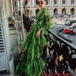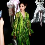 ลุคฟร้อนต์โรว์วันที่สามของ ประเดิมโชว์แรกที่ Elie Saab Haute Couture Autumn/Winter 2019 สวยดั่งสาวญี่ปุ่น ด้วย กิโมโนกำมะหยี่สีเขียวพาสเทล ลายดาวจาก Gucci ต่างหูไวท์โกลด์ประดับเพชรและแซฟไฟร์ทรงหยดน้ำ คอลเลกชั่น Temptations จาก Chopard และความติดกิ๊ฟอลังเช่นเคย