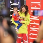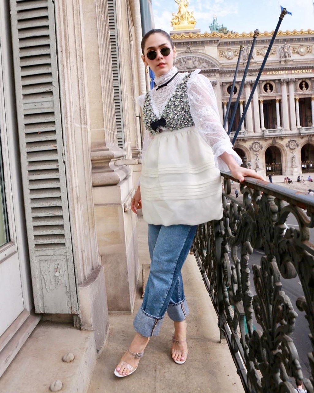 แม่กับความแมทช์ทั้งเสื้อนอกเสื้อใน สวมทับแบบมีความน่ารักเบาๆ สไตล์ mui mui เพิ่มความสตรีทด้วยยีนส์พับขา กับรองเท้าส้นสูงเรียบง่าย