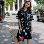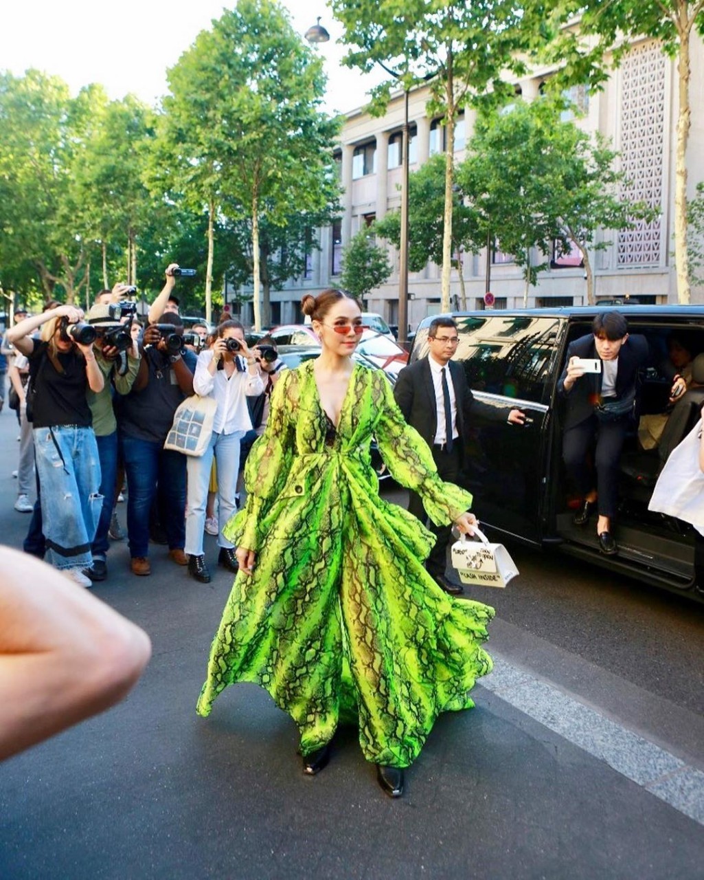 เดรสลายงู เทรนด์เขียวนีออน สุดฮอต แหวกให้สุด แมทช์กับบูทหนังดำสูงทรงคาวบอย เท่ๆ แมทช์กับกระเป๋า Off-White สีขาว