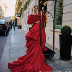 เดรสราตรีสีแดงสด ผ้าเงาแวววาว เล่นระบายทับซ้อนสวยงาม เน้นความยาวสวยอลังอีกเช่นเคย