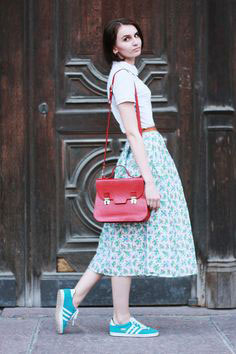 -การเลือก กระโปรง ยาวคลุมเข่า ที่มีสีสันสดใส ขอบอกว่าไม่ต้องคิดว่ามันจะเข้ากับเสื้อลำบาก ขอแค่มีเสื้อสีพื้นๆ อยู่ในตู้ก็ได้แล้วล่ะ จากภาพ ถ้าเลือกกระโปรงสีสันสดใส ก็ให้ใช้สีขาวกับทุกสิ่ง ทั้งเสื้อท่อนบน อาจเป็นแขนยาว หรือว่าแขนสั้นก็ได้