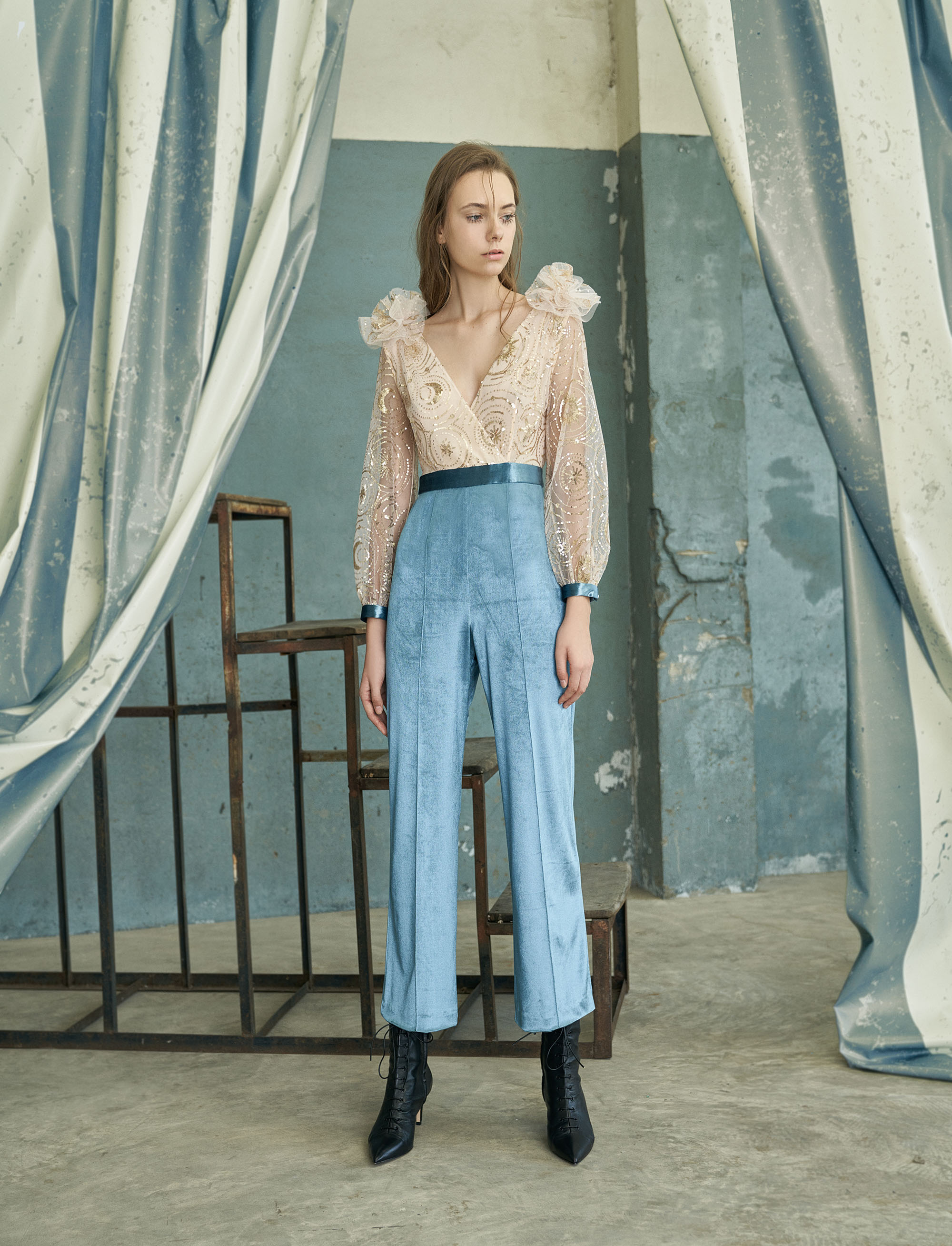 ตัดเย็บเป็น เสื้อแขนยาว ตกแต่งด้วยลูกไม้ใส่คู่กับกางเกง หรือ ชุดเดรสแขนยาว ตัดต่อด้วยผ้าตาข่ายที่เพิ่มรายละเอียดมากยิ่งขึ้นด้วยปลายแขน scallop (สแกลลอป) ชุดเดรสกลางวัน มาพร้อมเทคนิคเบิร์นเอ้าท์สร้างแพทเทิร์นที่เป็นเอกลักษณ์ในโทนสีฟ้าและสีม่วงตกแต่งระบายด้วยพู่ นอกจากนี้ได้หยิบนำรูปทรงสี่เหลี่ยมจัตุรัสที่ตกแต่งภายในคณะละครมาเป็นองค์ประกอบถ่ายทอดผ่านปลายกระโปรงชุดเดรสและลวดลายปักที่ให้ความรู้สึกสนุกสนาน