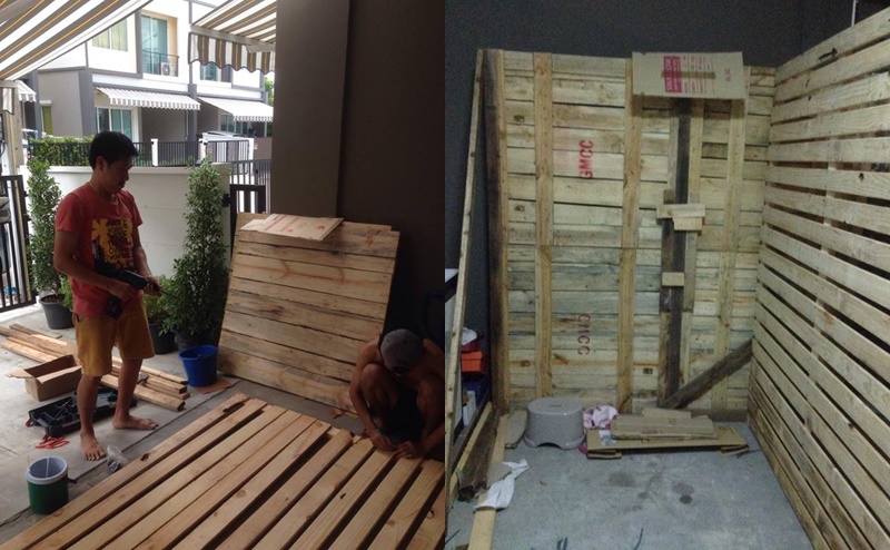 และด้วยความเป็นเด็กช่างกลของเจ้าบ่าว นางก็เลยพอจะมีฝีมืองานไม้อยู่บ้าง ก็เกณฑ์มาช่วยทำ แถมนางก็ดี๊ดีพาไปซื้อพวกไม้พาเลท แถวปทุมธานี อีกด้วย รวมประมาณ 2,500 บาท แล้วก็มาช่วยกันอออกแบบประกอบเป็นรูปเป็นร่างให้อีก ทำกันทั้งวันจนเสร็จ (ซึ้งใจสุดๆ)