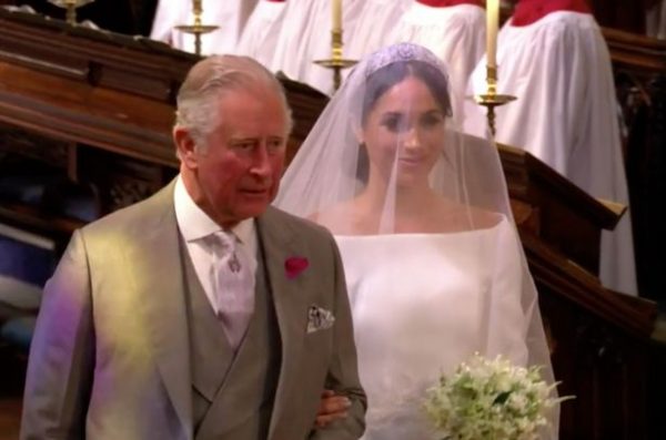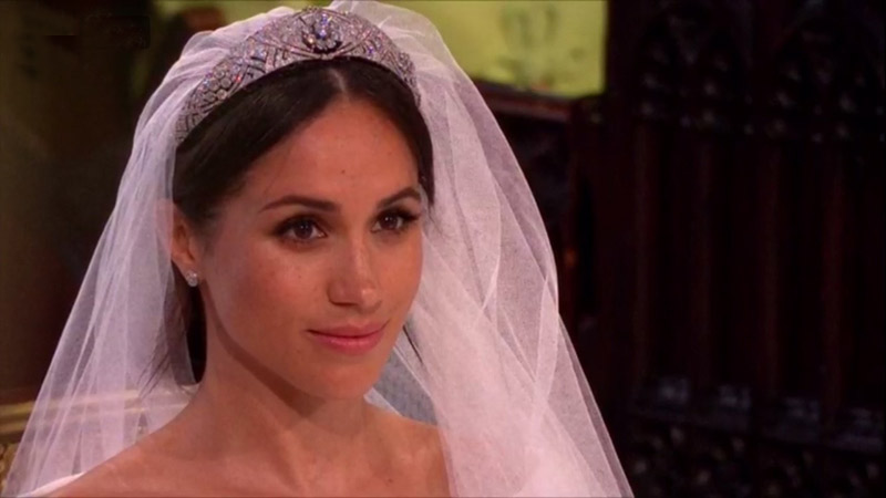 เมื่อเมแกน ปรากฏตัวในชุดแต่งงานสีขาวดีเทลเรียบหรู แขนยาว ไม่มีลายทั้งตัว ส่วนผ้าคลุมหน้า หรือเวลปักลวดลายดอกไม้ที่เป็นสัญลักษณ์ของทั้ง 53 ประเทศในเครือจักรภพ และดอกไม้ที่เธอชื่นชอบลงไปในเวลลากยาวกว่า 5 เมตร ผมก็เกล้ามวยแบบง่ายๆ สง่างามดั่งเจ้าหญิง เดินเข้าไปในโบสถ์เซนต์จอร์จ เพื่อทำพิธีทางศาสนา โดยมีเพจบอย 2 คน เป็นผู้ถือชายกระโปรงตามมาด้านหลัง จนถึงจุดที่ทำพิธีคู่กับเจ้าชายแฮร์รี่