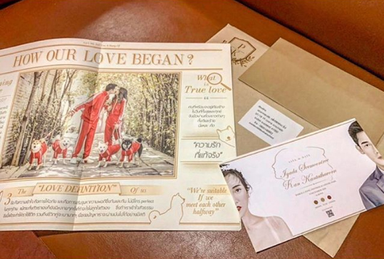 อลังการจัดเต็มสุดๆ กับการ์ดแต่งงาน ที่ทั้งคู่ใส่รายละเอียดเอาไว้เยอะมาก โดยแบ่งออกเป็น 2 ส่วน ส่วนแรกเป็นการ์ดขนาดเท่ากระดาษ A4 มีจำนวน 8 หน้า ให้ออกมาเป็นหนังสือพิมพ์บอกเล่าเรื่องราวความรักของทั้งคู่ รวมถึงที่มาของน้องหมาแต่ละตัวที่เลี้ยงเอาไว้ ซึ่งเจ้าสาวตั้งใจให้แขกที่มาในงาน ถ่ายรูปเป็นที่ระลึกขณะลงอ่านหนังสือพิมพ์ก่อนมาร่วมงาน ส่วนที่สอง เป็นการ์ดขนาดปกติ