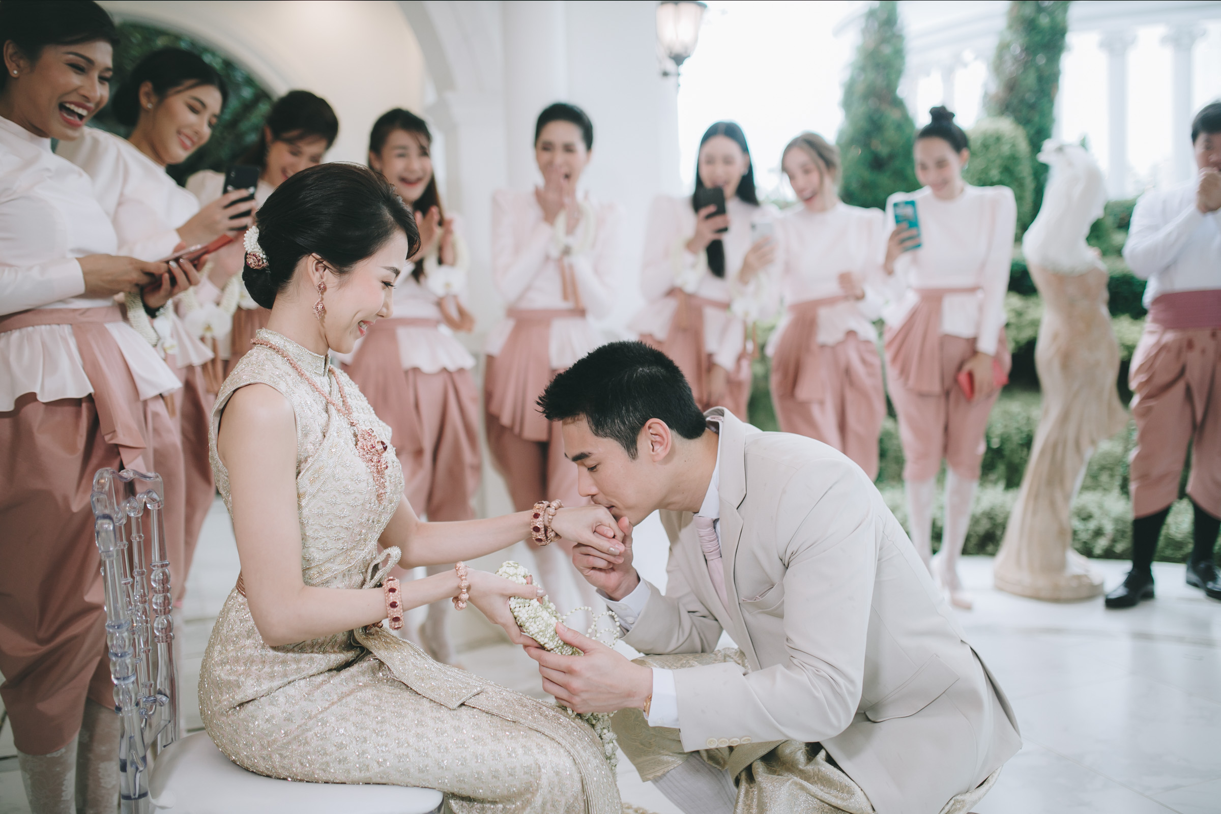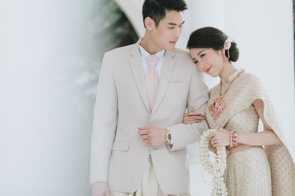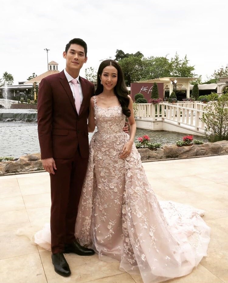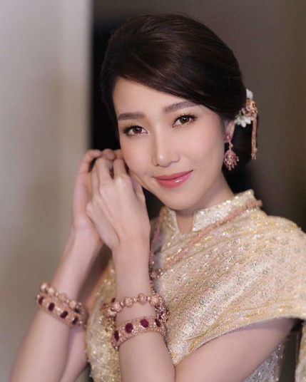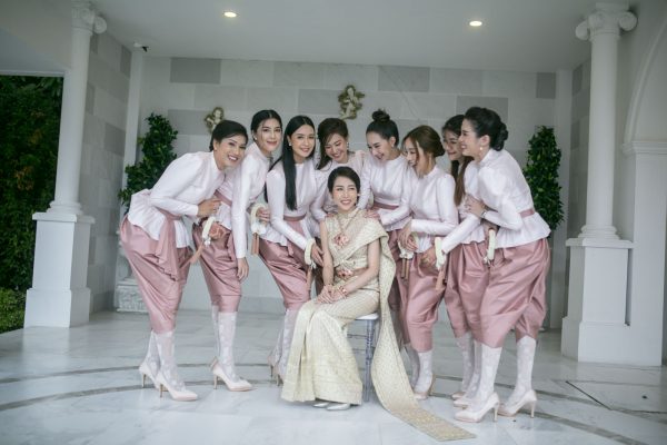 งานเช้าเน้นความเป็นไทย สวมโจงกระเบนสีชมพูกลีบบัวอ่อนๆ และราตรีสีแดงในงานเลี้ยงฉลองตอนเย็น