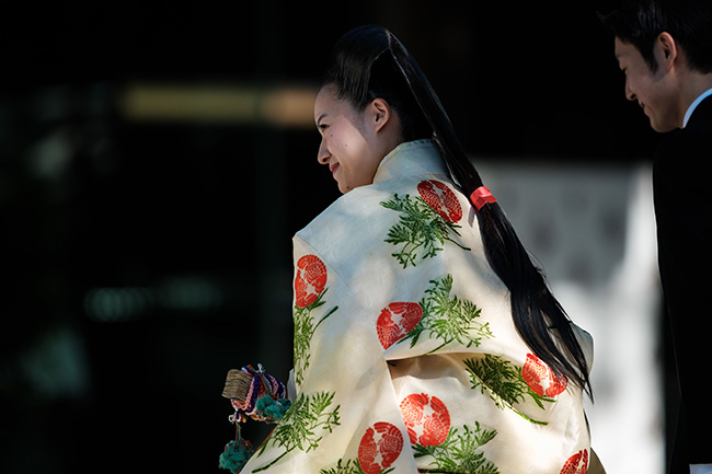 ขณะที่นายเคอิ สวมชุดทักซิโด้หางยาวสีดำตามแบบตะวันตก กางเกงสีเทาและถือหมวกซึ่งเคยเป็นสมบัติส่วนพระองค์ของเจ้าชายโนริฮิโตะแห่งทาคามาโดะ พระบิดาผู้สิ้นพระชนม์ของเจ้าหญิงอายาโกะ