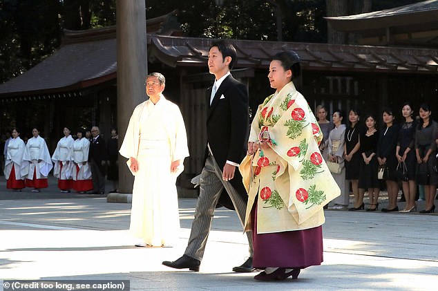 สำหรับพิธีเสกสมรสของเจ้าหญิงอายาโกะ จัดขึ้นเป็นการส่วนพระองค์ที่ศาลเจ้าเมจิ กรุงโตเกียว ตามธรรมเนียมประเพณีแบบชินโตที่ดูงดงามในความเรียบง่าย ซึ่งมีเพียงมีแต่สมาชิกในราชวงศ์ญี่ปุ่นเท่านั้น ภายในพิธีบ่าวสาวมีการแลกแหวน ดื่มสาเก รวมถึงมอบกิ่งไม้ศักดิ์สิทธิ์ (ทามากุชิ) เป็นของบรรณาการ พร้อมแลกคำปฎิญาณและแหวนแต่งงานตามธรรมเนียม โดยหลังจากเสร็จสิ้นพิธีเสกสมรส เจ้าหญิงอายาโกะได้เปลี่ยนนามสกุล เป็น อายาโกะ โมริยะ ตามสามีด้วย
