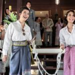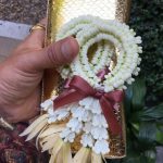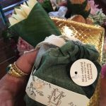 เต็มเปี่ยมไปด้วยกลิ่นอายของความเป็นไทย ด้วยของชำร่วยที่ดูแล้วเลอค่าสุดๆ ซึ่งภายในถุงผ้าสีเขียวที่คล้ายกับใบตองจะเป็นสบู่แบบไทยๆ วางถุงผ้าลงบนผ้าสีทองสวย พร้อมช่อดอกจำปีที่วางตกแต่งมาอย่างสวยงาม