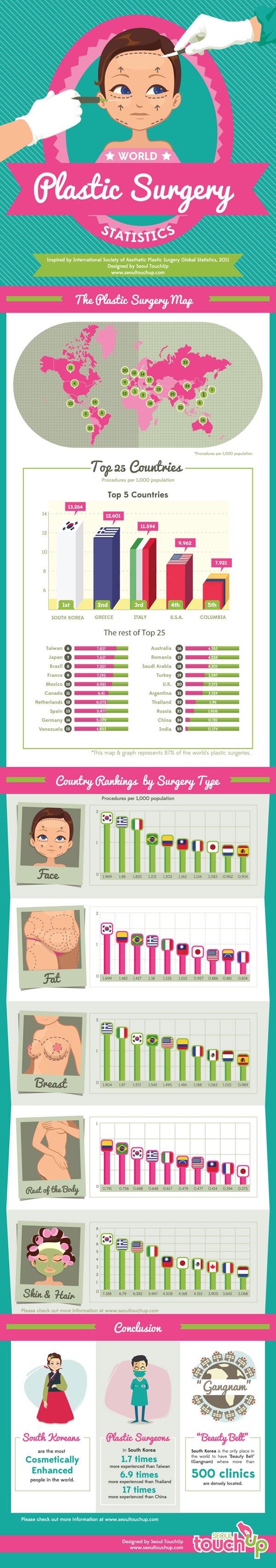 วันนี้ Women Mthai จะพาเพื่อนๆไปดูสถิติที่น่าสนใจเกี่ยวกับการทำ ศัลยกรรม ในแต่ละประเทศ ซึ่งแน่นอนว่า ประเทศเกาหลีใต้ ย่อมมาเป็นอันดับหนึ่งอยู่แล้ว ซึ่งหากคิดตามค่าเฉลี่ยของจำนวนประชากร พบว่า เกาหลีใต้เป็นประเทศที่มีคนศัลยกรรมมากที่สุดในโลก โดยใน 77 คนจะมี 1 คนที่เคยผ่าน ศัลยกรรมเสริมความงาม และจุดที่นิยมทำ ศัลยกรรม มากที่สุดคือการทำตาสองชั้น ส่วนอันดับอื่นๆ รองลงมาได้แก่ กรีซ อิตาลี สหรัฐอเมริกา โคลัมเบีย ไต้หวัน และญี่ปุ่น ตามลำดับ