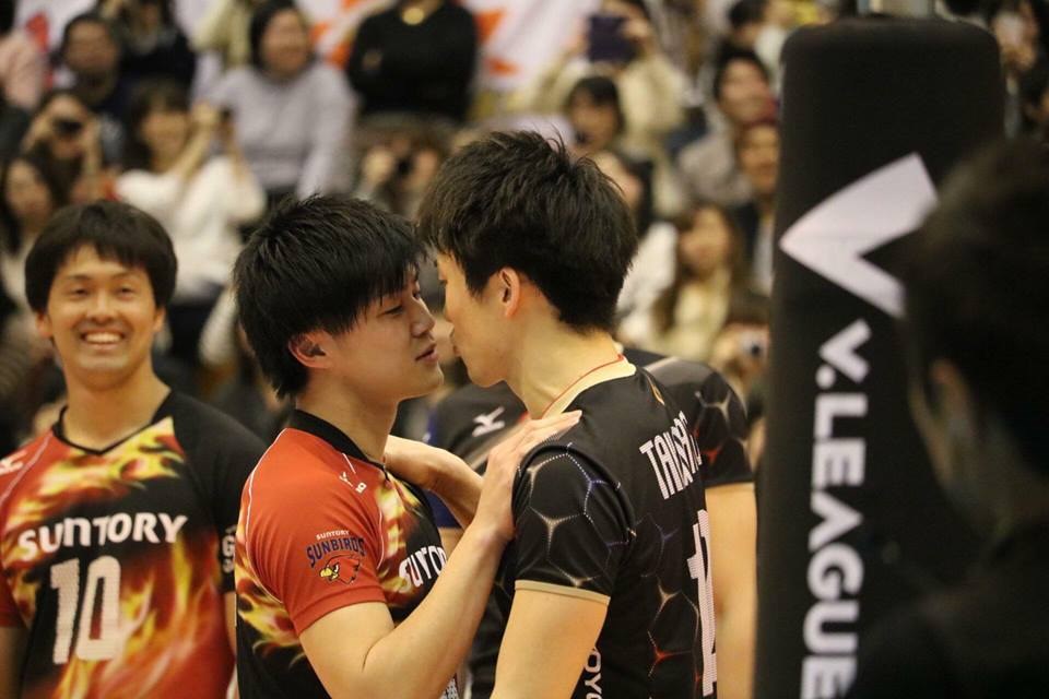 สาวๆ ฟินกันทั้งสนามเลยทีเดียว หลังจากที่เกมการแข่งขันวอลเลย์บอลชาย V-League All Star ที่ประเทศญี่ปุ่น ที่นักกีฬาต่างทีมเกิดอาการหงุดหงิดโมโหกันกลางเกม ถึงขั้นเดินข้ามแดนมาผลักกันไปมา แต่สุดท้ายเกมพลิกชนิดที่สาวๆ งงกันทั้งสนาม เพราะจบลงด้วยการจุ๊บปากกันเบาๆ แต่ทำเอาคนดูเขินกันระงม..แบบนี้ก็ได้เหรอ น่ารักง่ะ